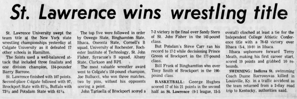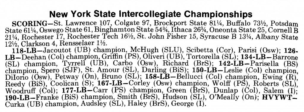 St. Lawrence University [NY] 107, Colgate University [NY] 97, SUNY Brockport [NY] 81.25, University at Buffalo [NY] 73.5, SUNY Potsdam [NY] 61.25, SUNY Oswego [NY] 61, Binghamton University [NY] 54.75, Ithaca College [NY] 26.75, SUNY Oneonta [NY] 25, Cornell University (B Team) [NY] 21.25, University of Rochester [NY] 17, Rochester Institute of Technology [NY] 16.5, St. John Fisher College [NY] 15, Syracuse University (B Team) [NY] 13.25, University at Albany [NY] 12.5, Clarkson College of Technology [NY] 4, Rensselaer Polytechnic Institute [NY] 1.5