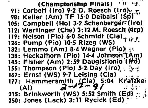 Kevin Nelson (Pioneer) > Curt Schmidt (Clarence) decision 6-0