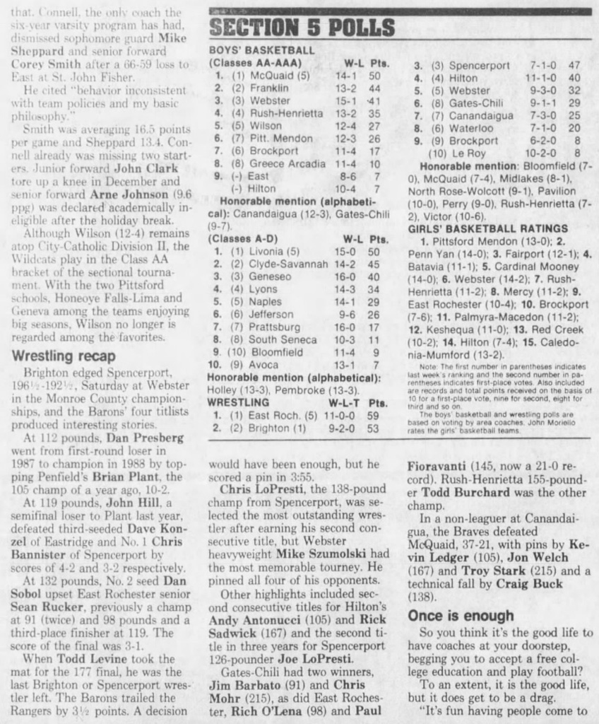 Brighton [NY] 198.5, Spencerport [NY] 192.5, East Rochester [NY] 160, Gates Chili [NY] 138.5, Webster [NY] 135.5, Hilton [NY] 132, Brockport [NY] 100.5, Greece Athena [NY] 98.5, Rush-Henrietta [NY] 88.5, Fairport [NY] 79, Churchville-Chili [NY] 74.5, Penfield [NY] 60, East Irondequoit Eastridge [NY] 51, Irondequoit [NY] 49.5, Batavia [NY] 36.5, Greece Olympia [NY] 34, Pittsford [NY] 29