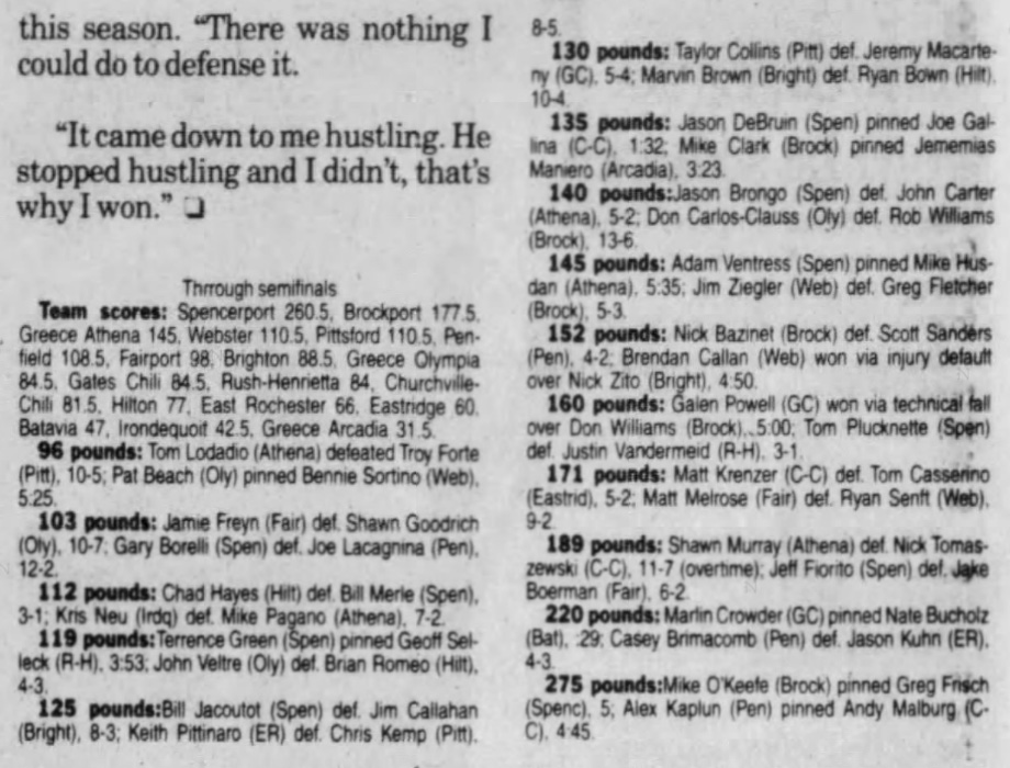 Spencerport [NY] 284.5, Brockport [NY] 183.5, Greece Athena [NY] 149, Webster [NY] 114.5, Pittsford [NY] 110.5, Penfield [NY] 108.5, Fairport [NY] 102.5, Gates Chili [NY] 96.5, Brighton [NY] 93.5, Greece Olympia [NY] 93.5, Rush-Henrietta [NY] 84, Churchville-Chili [NY] 81.5, Hilton [NY] 77, East Rochester [NY] 66, East Irondequoit Eastridge [NY] 60, Batavia [NY] 47, Irondequoit [NY] 46.5, Greece Arcadia [NY] 31.5
