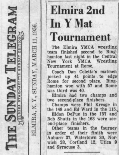 Binghamton YMCA [NY] 57, Elmira YMCA [NY] 41, Rome YMCA [NY] 40, Auburn YMCA [NY] 37, Watertown YMCA [NY] 30, Norwich YMCA [NY] 28, Cortland YMCA [NY] 12, Utica YMCA [NY] 9, Central YMCA of Syracuse [NY] 3