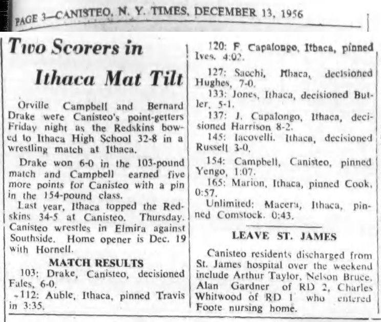 Bernard Drake (Canisteo) > Bill Fales (Ithaca) decision 6-0