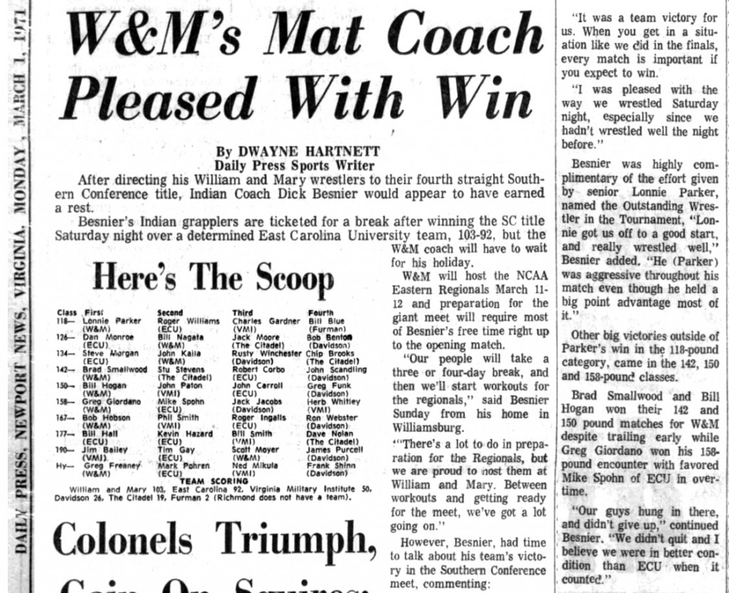 Lonnie Parker (CWM) > Roger Williams (ECU) decision 7-1
