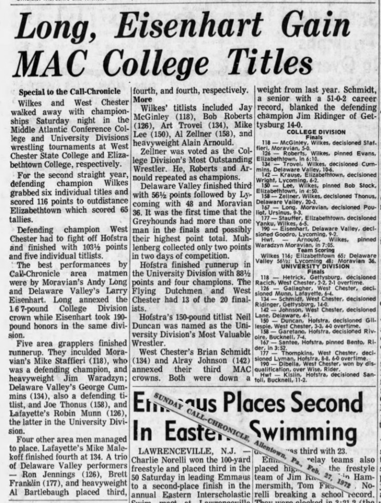 Wilkes University [PA] 116, Elizabethtown College [PA] 65, Delaware Valley University [PA] 56.5, Lycoming College [PA] 48, Moravian College [PA] 36, Susquehanna University [PA] 22, Ursinus College [PA] 16, Swarthmore College [PA] 15, Albright College [PA] 12, Johns Hopkins University [MD] 10, Widener University (Pennsylvania Military College) [PA] 8, Lebanon Valley College [PA] 7, Juniata College [PA] 6, University of Scranton [PA] 5, Haverford College [PA] 2.5, Dickinson College [PA] 2, Muhlenberg College [PA] 2