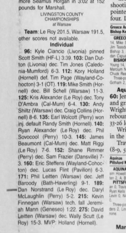 Mike Smith (Hornell) > Bill Schell (Warsaw) major decision 11-3
