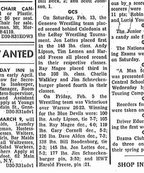 Al Hettrick (Dansville) > Vince Hodgdon (Warsaw) decision 6-4 (1OT)