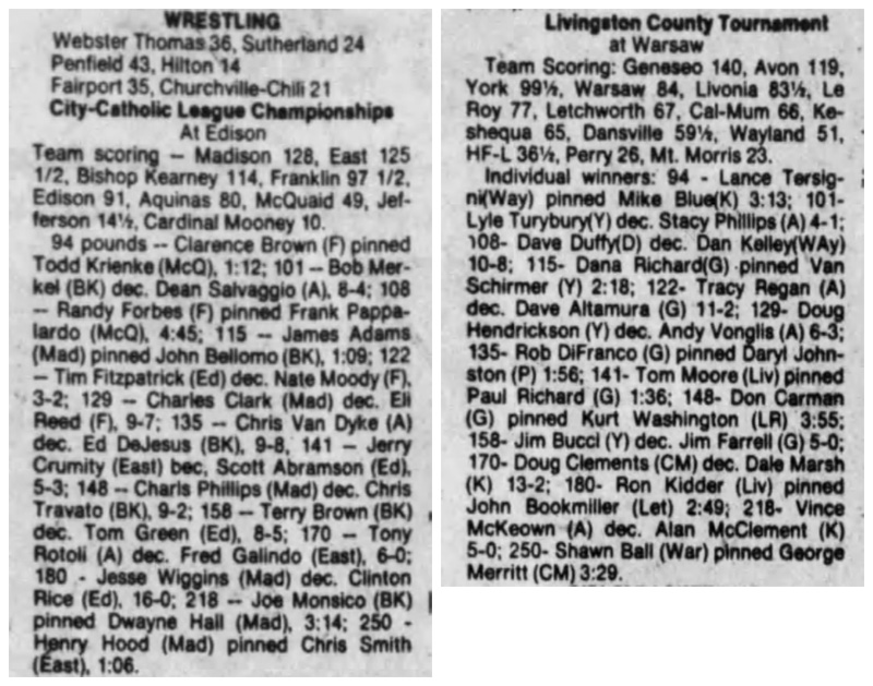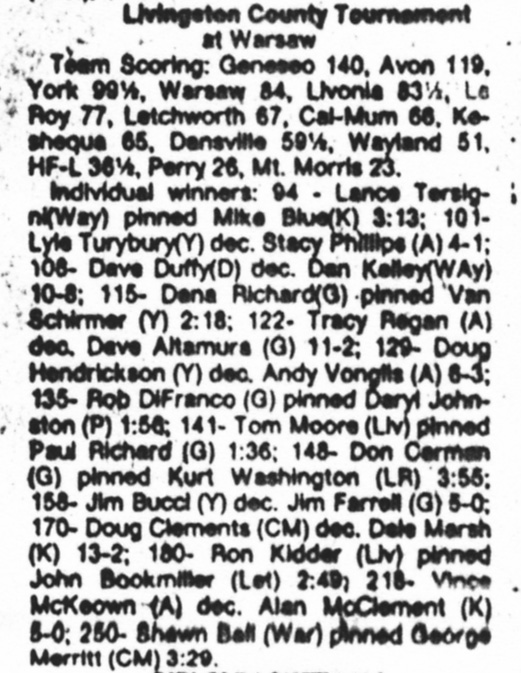 Vince McKeown (Avon) > Allen McClements (Keshequa) decision 5-0