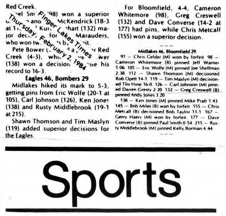 98 Cameron Whitmore (Bloomfield) > Jeff Warner (Midlakes) fall 1:06