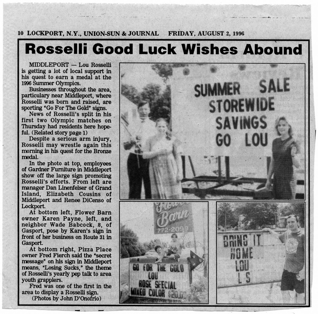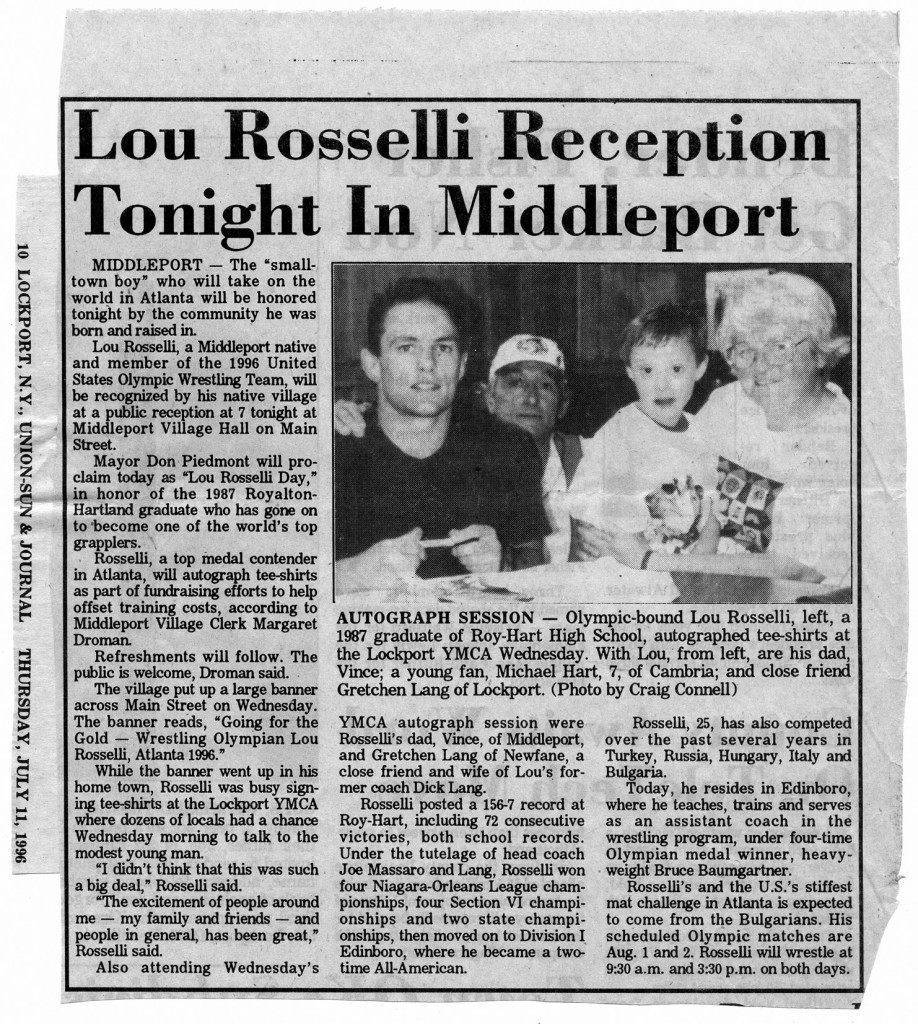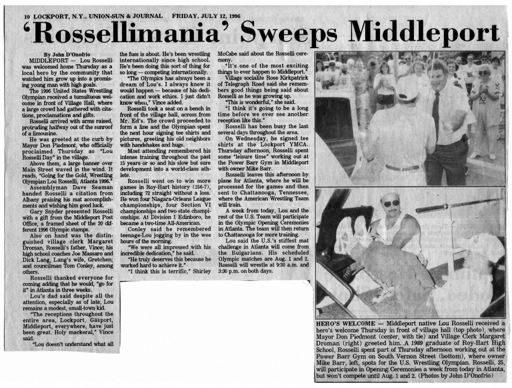 Middleport resident Lou Rosselli has left for Atlanta to compete in wrestling at the 1996 Summer Olympic games. Lou received a big send-off from his neighbors in Middleport, with Mayor Donald Piedmont presenting Rosselli with a plaque and declaring July 11 "Lou Rosselli Day." From Left are Rosselli and Piedmont. SOURCE: Lockport Union-Sun and Journal, July 13, 1996.
