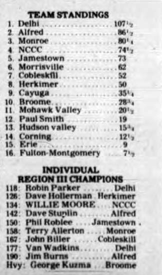 SUNY Delhi [NY] 107.5, Alfred State College [NY] 86.5, Monroe Community College [NY] 80.25, Niagara County Community College [NY] 74.5, Jamestown Community College [NY] 73, Morrisville State College [NY] 62, SUNY Cobleskill [NY] 52, Herkimer County Community College [NY] 50, Cayuga Community College [NY] 35.25, Broome Community College [NY] 28.25, Mohawk Valley Community College [NY] 20.5, Paul Smith's College [NY] 19, Hudson Valley Community College [NY] 15.25, Corning Community College [NY] 12.5, Erie Community College [NY] 9, Fulton-Montgomery Community College [NY] 7.5