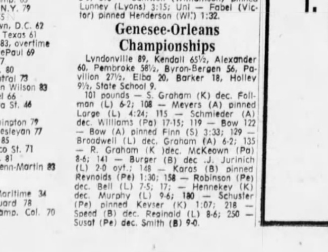 Shane Graham (Kendall) > Mark Follman (Lyndonville) decision 6-2
