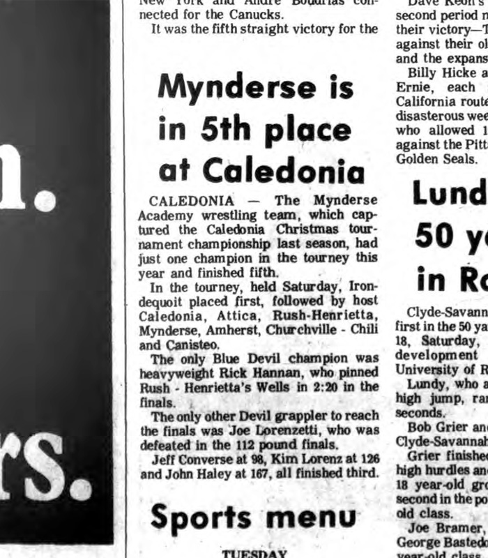 Lee VanValkenburg (Attica) > Joe Lorenzetti (Mynderse) decision 2-0