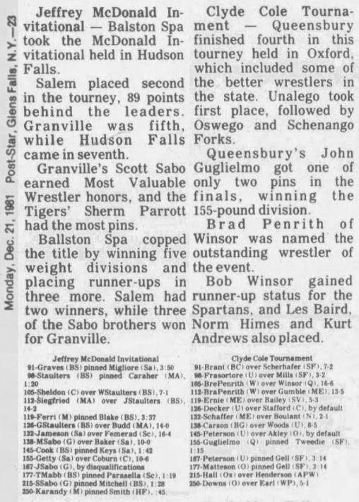 Curt Andrews (Queensbury) > Paul Dorsey (Bethlehem) decision 2-1