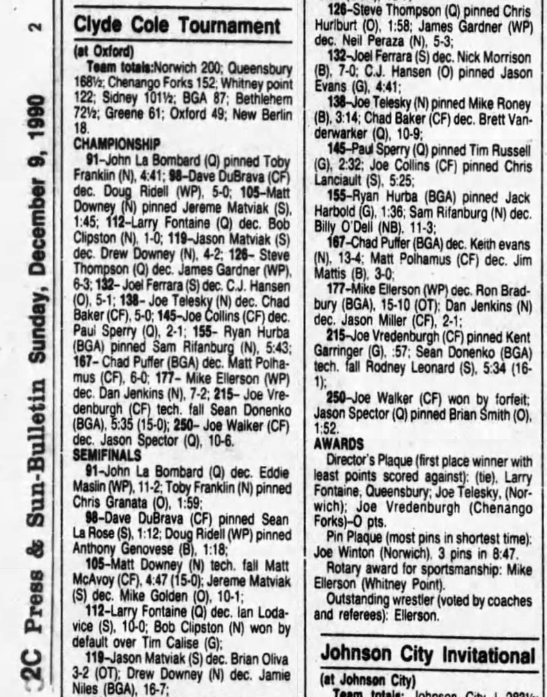 John LaBombard (Queensbury) > Toby Franklin (Norwich) fall 4:41