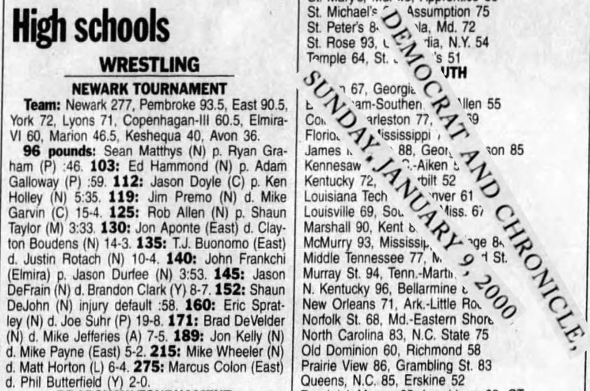 Mike Wheeler (Newark) > Matt Horton (Lyons) decision 6-4