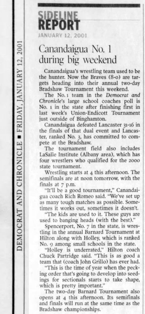 Lancaster [NY] 175.5, Canandaigua [NY] 171, La Salle Institute [NY] 138.5, Iroquois [NY] 122, Valley Central [NY] 106, Marcellus [NY] 101, Pittsford [NY] 88, Webster [NY] 80, Ithaca [NY] 75, Brockport [NY] 69.5, Hornell [NY] 63, Gates Chili [NY] 60.5, Canastota [NY] 46, Falconer [NY] 44, Victor [NY] 14.5