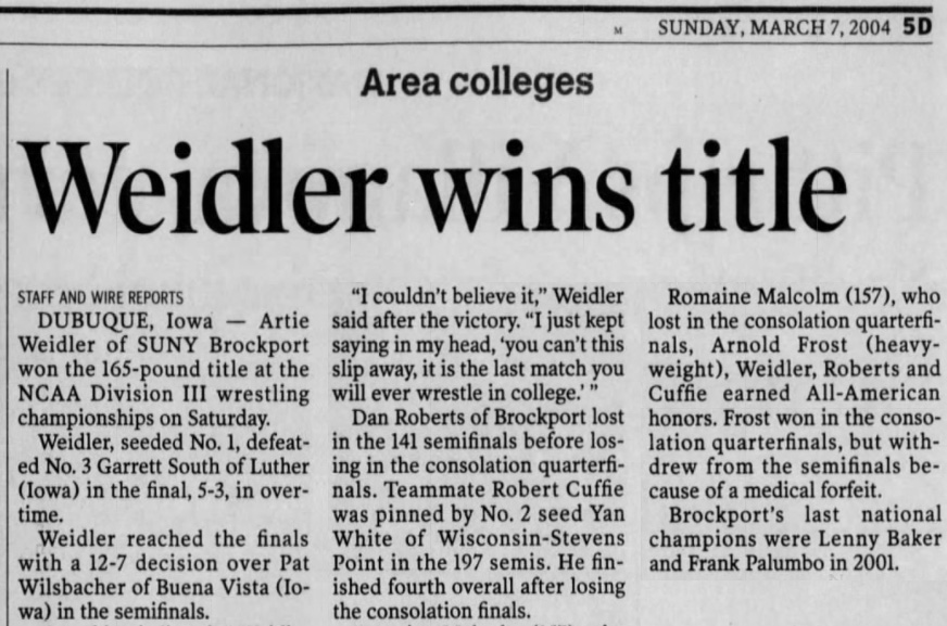 Daniel Roberts (Brockport) > Kevin Owens (CC) major decision 14-5