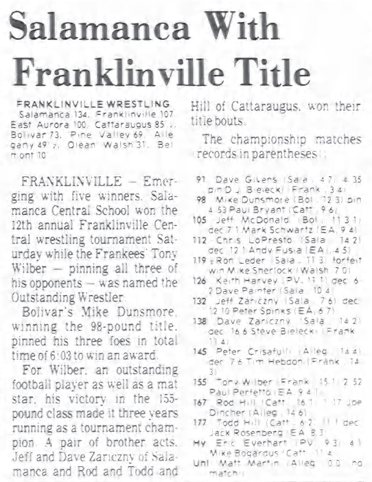 David Zariczny (Salamanca) > Steve Bielecki (Franklinville) major decision 16-6