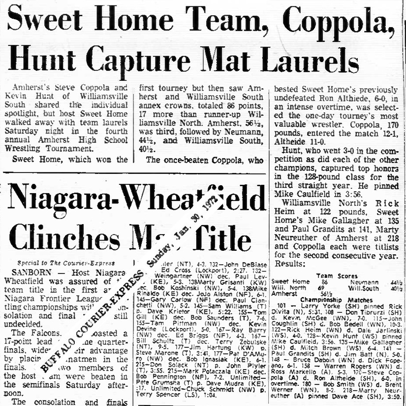Sweet Home [NY] 86, Williamsville North [NY] 69, Amherst [NY] 56.5, Bishop Neumann [NY] 44.5, Williamsville South [NY] 40.5