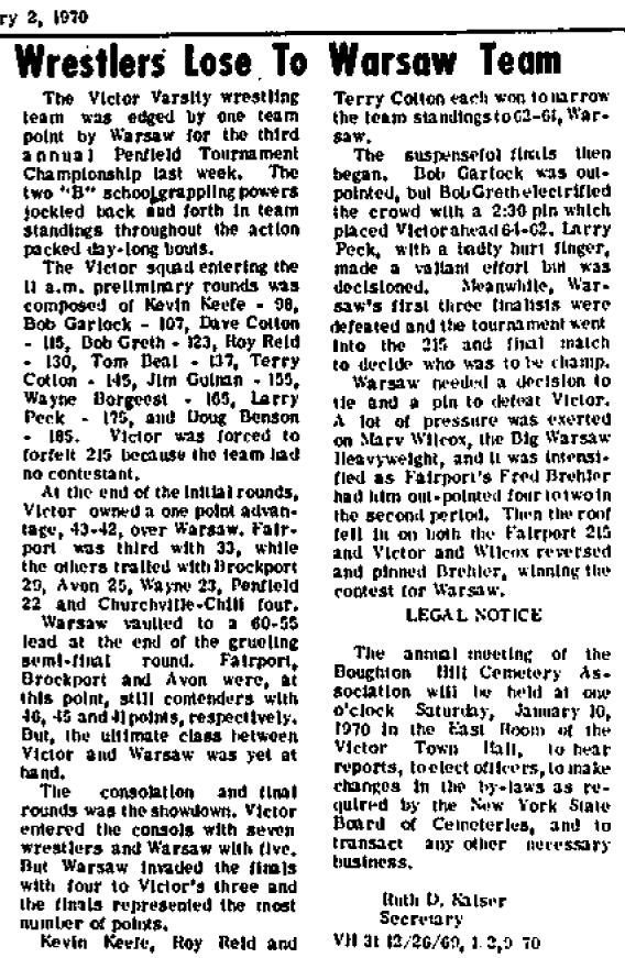 Bob Greth (Victor) > Doug Hulme (Warsaw) fall 3:40