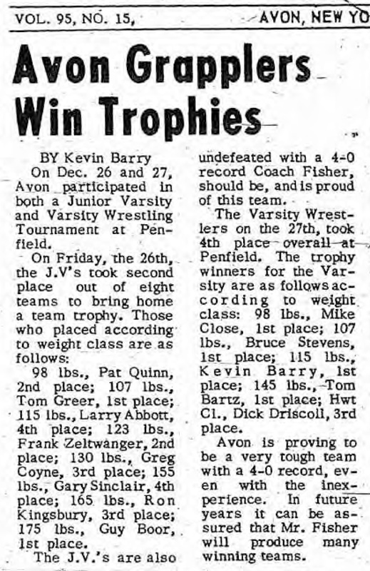 Kevin Barry (Avon) > Jerry DeHey (Brockport) decision 3-1