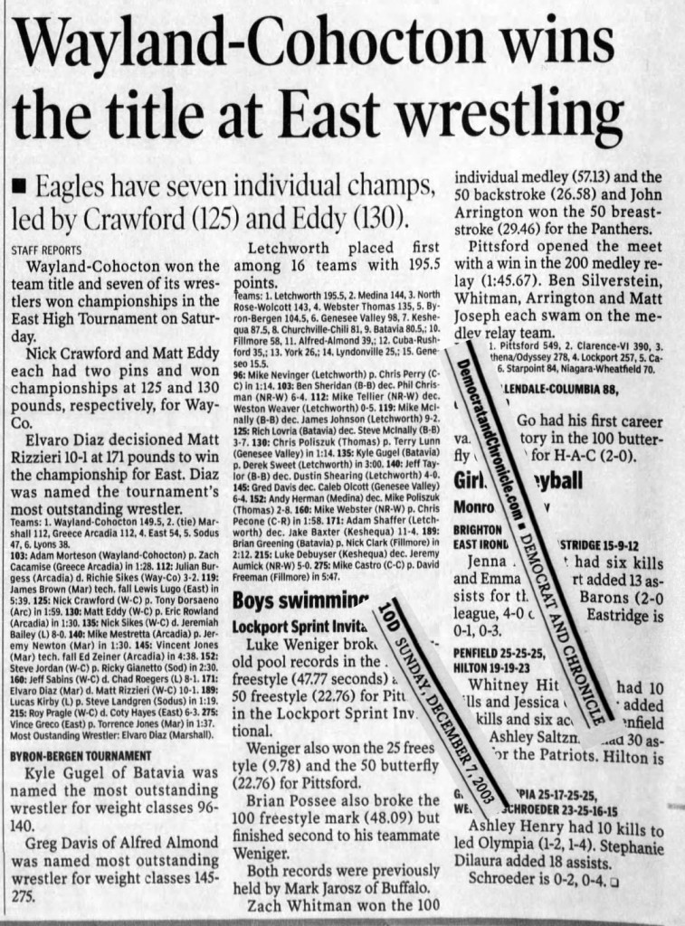 Kyle Gugel (Batavia) > Derek Sweet (Letchworth) fall 3:00