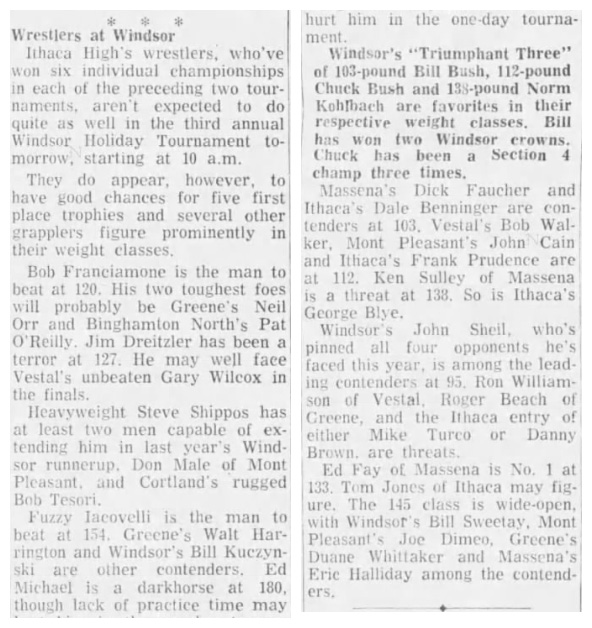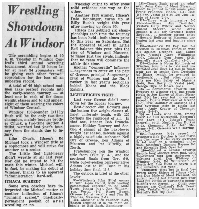 Bill Bush (Windsor) > Dale Benninger (Ithaca) decision 3-0