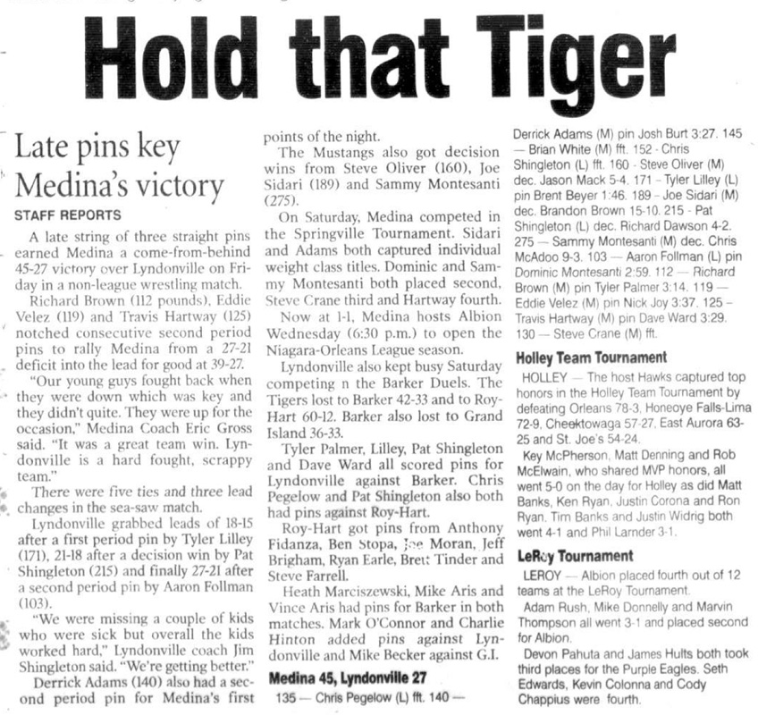 Derrick Adams (Medina) > Josh Burt (Lyndonville) fall 3:27