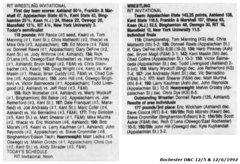 Mike Kohl (Oswego) > Ed Moore (FMC) forfeit
