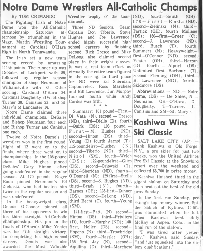 Batavia Notre Dame [NY] 111.5, Lockport DeSales [NY] 89, Bishop Neumann [NY] 85, Cardinal O'Hara [NY] 34, Cardinal Dougherty [NY] 31.5, Bishop Turner [NY] 30, Canisius [NY] 23, St. Mary's of Lancaster [NY] 14