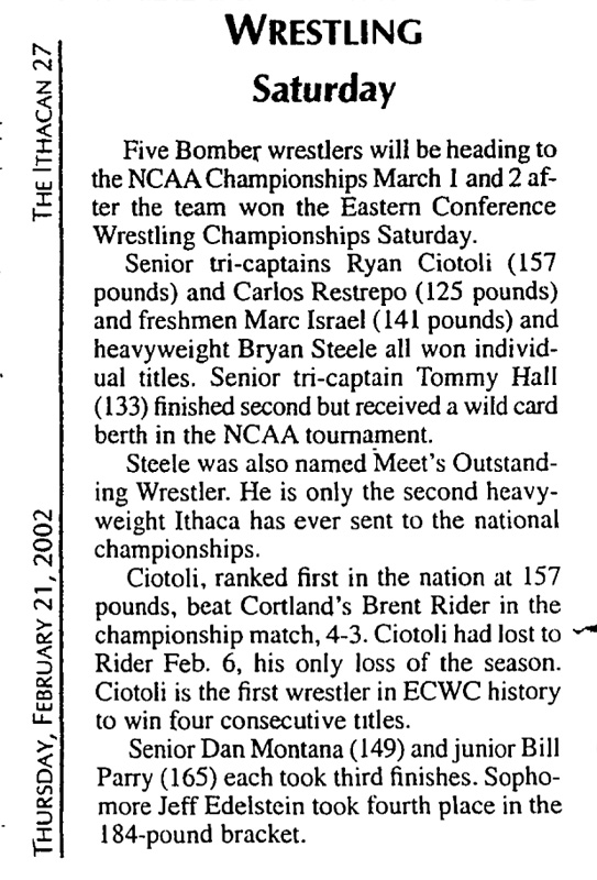 Ryan Ciotoli (IC) > Brent Rider (Cortland) decision 4-3