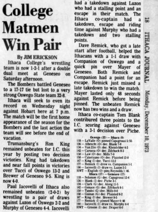 Tony Companion (Oswego) = Dave Remick (IC) draw 1-1