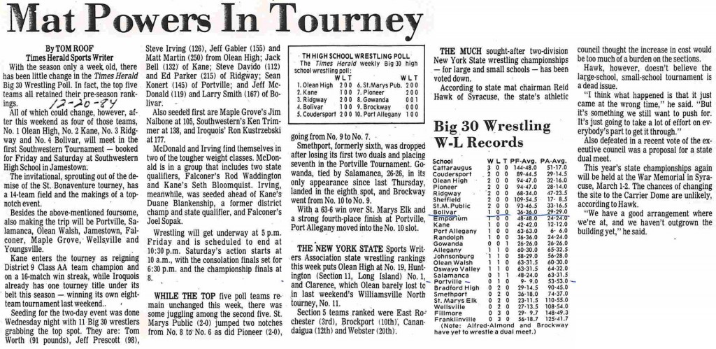 Steve Irving (Olean) > Joel Sopak (Falconer) decision 7-0