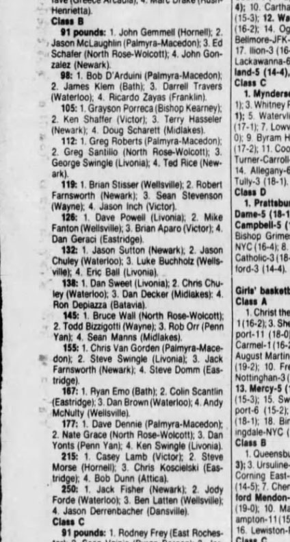 Robert Farnsworth (Newark) > Brian Stisser (Wellsville) decision 1-0