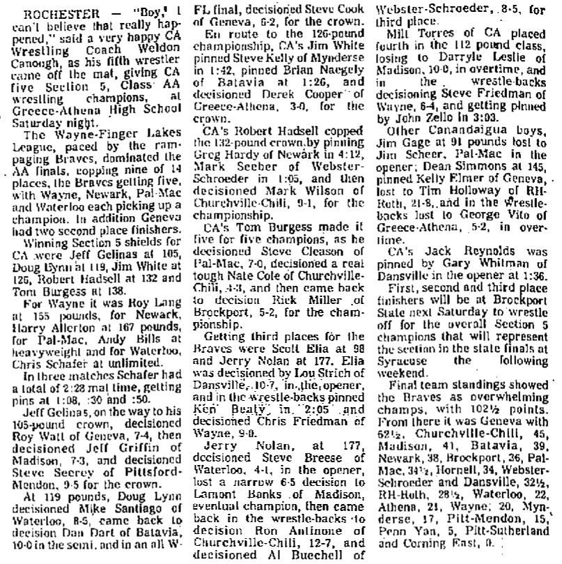 Canandaigua [NY] 102.5, Churchville-Chili [NY] 45, Geneva [NY] 42.5, Madison (Rochester) [NY] 41, Newark [NY] 38, Brockport [NY] 36, Palmyra-Macedon [NY] 34.5, Hornell [NY] 34, Dansville [NY] 32.5, Webster Schroeder [NY] 32.5, Batavia [NY] 29, Rush-Henrietta Roth [NY] 28.5, Waterloo [NY] 23, Greece Athena [NY] 21, Wayne [NY] 20, Mynderse [NY] 17, Pittsford Mendon [NY] 15, Penn Yan [NY] 5,