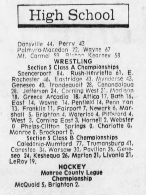 Caledonia-Mumford [NY] 77, Trumansburg [NY] 41, Canisteo [NY] 34, Warsaw [NY] 30, Keshequa [NY] 26, Pavilion [NY] 26, Geneseo [NY] 24, Livonia [NY] 21, Marion [NY] 21, Le Roy [NY] 19, Lyndonville [NY] 19, North Rose-Wolcott [NY] 19,