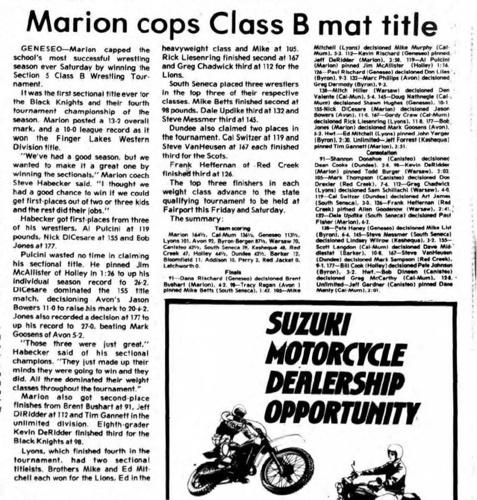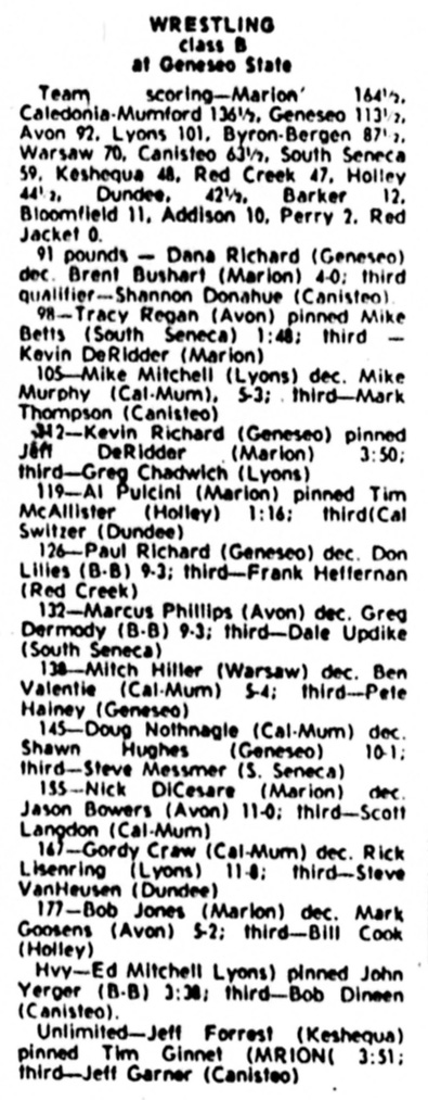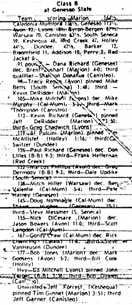 Marion [NY] 164.5, Caledonia-Mumford [NY] 136.5, Geneseo [NY] 113.5, Lyons [NY] 101, Avon [NY] 92, Byron-Bergen [NY] 87.5, Warsaw [NY] 70, Canisteo [NY] 63.5, South Seneca [NY] 59, Keshequa [NY] 48, Red Creek [NY] 47, Holley [NY] 44.5, Dundee [NY] 42.5, Barker [NY] 12, Bloomfield [NY] 11, Addison [NY] 10, Perry [NY] 2,