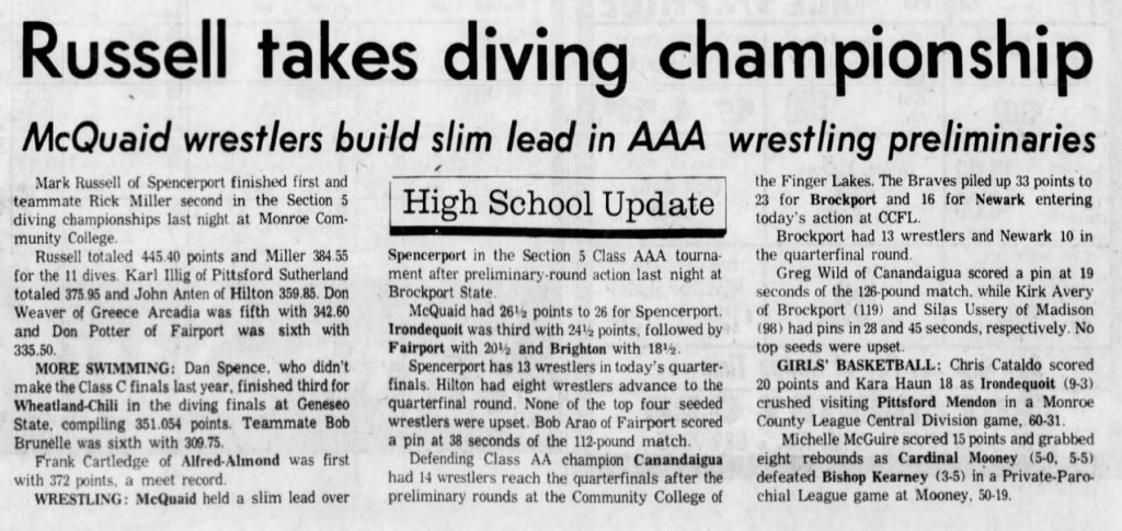 Spencerport [NY] 155.5, McQuaid Jesuit [NY] 126.5, Hilton [NY] 112.5, Irondequoit [NY] 109, Fairport [NY] 84, Churchville-Chili [NY] 82, Rush-Henrietta Sperry [NY] 74, Brighton [NY] 69, Penfield [NY] 57, Greece Athena [NY] 55.5, Greece Olympia [NY] 36, Franklin (Rochester) [NY] 28, Edison Tech (Rochester) [NY] 26, East High (Rochester) [NY] 22, Greece Arcadia [NY] 20.5, Webster Thomas [NY] 19, East Irondequoit Eastridge [NY] 10, Bishop Kearney [NY] 9,