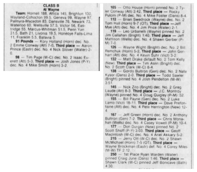 Brian Swedrock (Wayne) > Tom Hall (Hornell) decision 9-7 (1OT)
