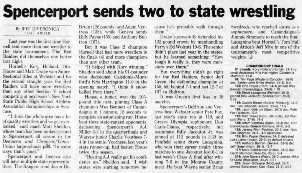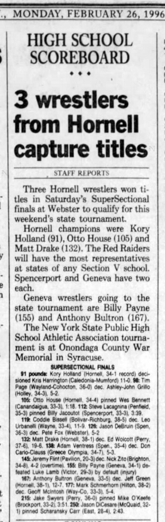 Mat Drake (Hornell) > Ed Wolcott (Perry) major decision 19-6
