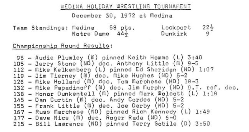 Medina [NY] 58, Batavia Notre Dame [NY] 44.5, Lockport [NY] 22.5, Dunkirk [NY] 9