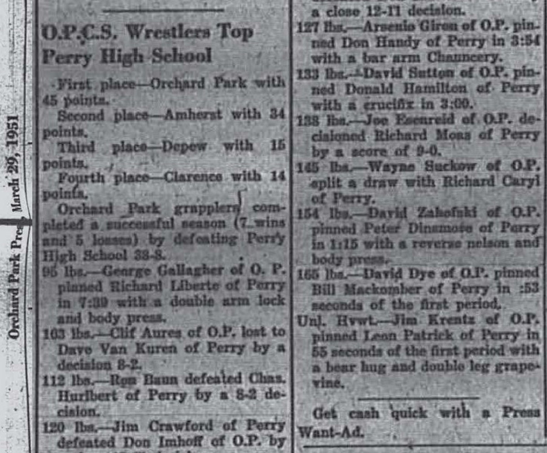 Orchard Park [NY] 45, Amherst [NY] 34, Depew [NY] 15, Clarence [NY] 14,