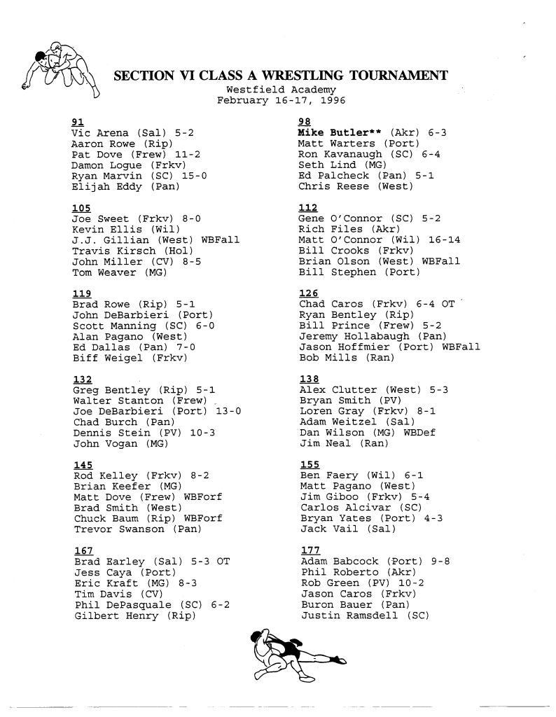 Mike Butler (Akron) > Matt Warters (Portville) decision 6-3