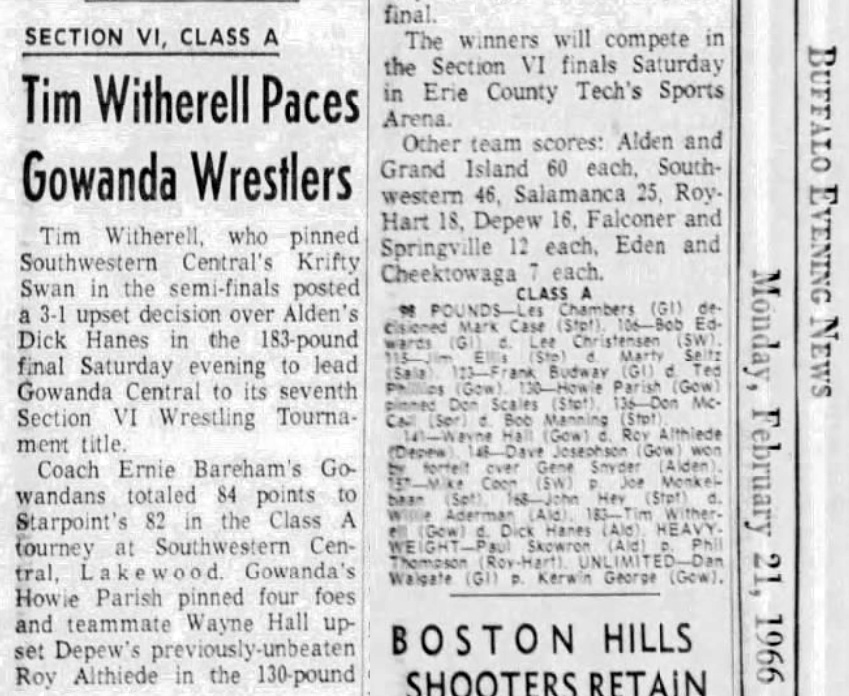 Tim Witherell (Gowanda) > Dick Haines (Alden) decision 3-1