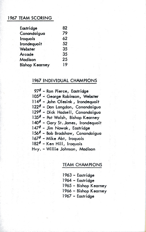 East Irondequoit Eastridge [NY] 82, Canandaigua [NY] 79, Iroquois [NY] 62, Irondequoit [NY] 52, Arcade [NY] 35, Webster [NY] 35, Madison (Rochester) [NY] 25, Bishop Kearney [NY] 19
