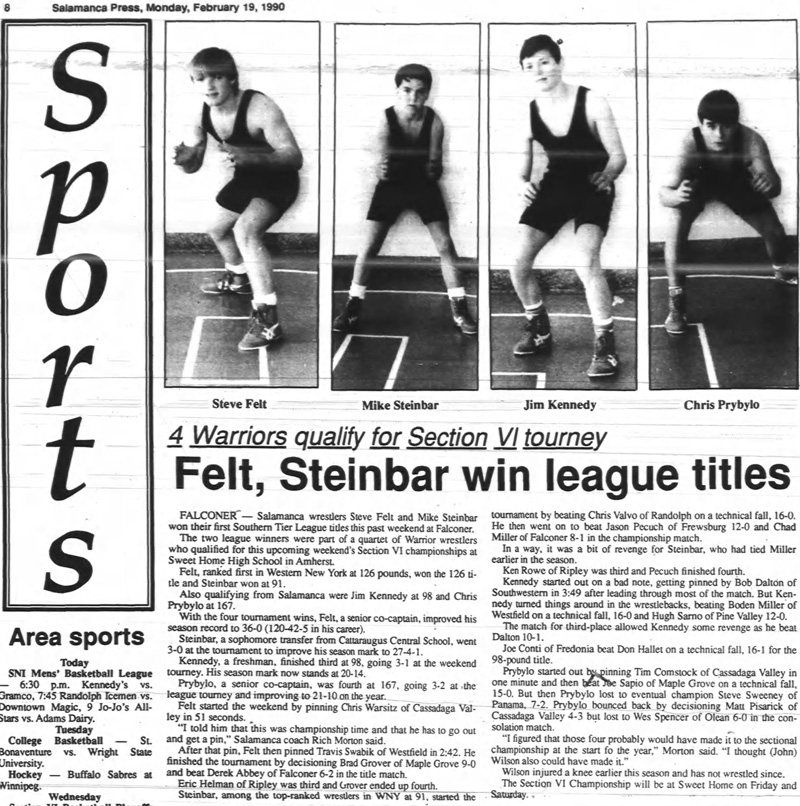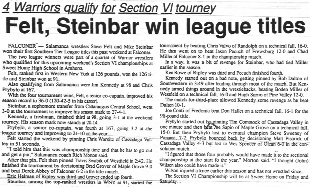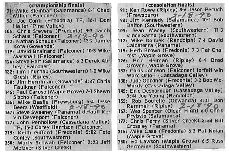 Mike Steinbar (Salamanca) > Chad Miller (Falconer) decision 8-1