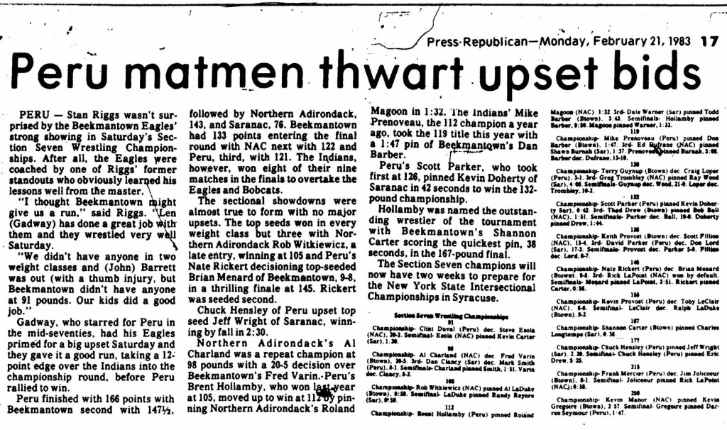 Terry Guynup (Beekmantown) > Craig Loper (Peru) decision 3-1