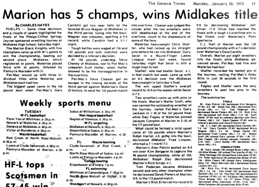 Mike Cleere (Waterloo) > Gary VanKouwenberg (Marion) fall