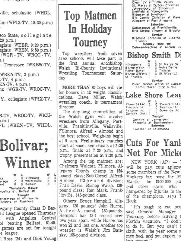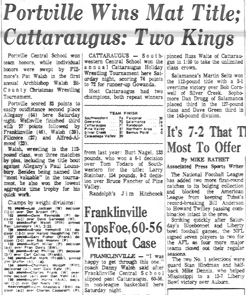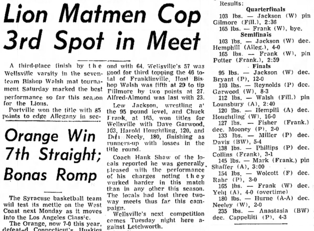 Charles Frank (Wellsville) > Dan Yehl (Allegany) decision 4-1