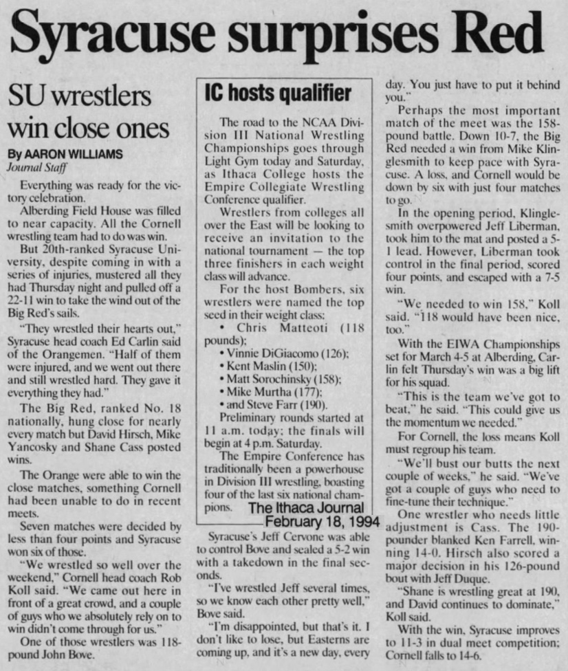 Jeff Cervone (SU) > John Bove (CU) decision 5-2